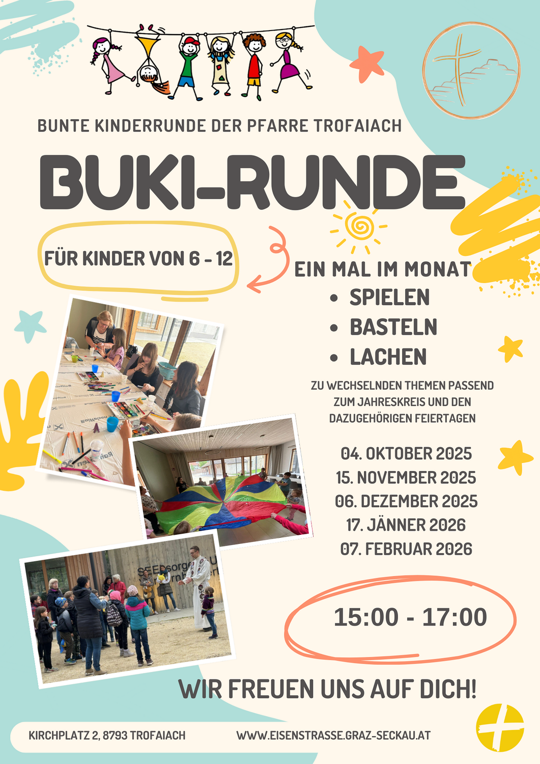 Das Team der „Bunten Kinderrunde“ gestaltet einmal im Monat einen bunten Nachmittag für Kinder von ca. 6 bis 12 Jahren im Seelsorgeraum Trofaiach.